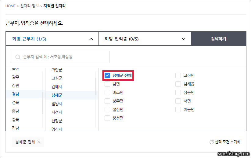 ▲ [경남] - [남해군] 지역을 선택하여 채용공고, 구인공고를 검색합니다. 근무를 희망하는 주변 근무지를 추가하여 검색할 수도 있습니다. 사천, 하동, 진주 등 주변 도시를 추가하여 검색해보시길 바랍니다.