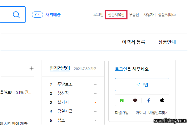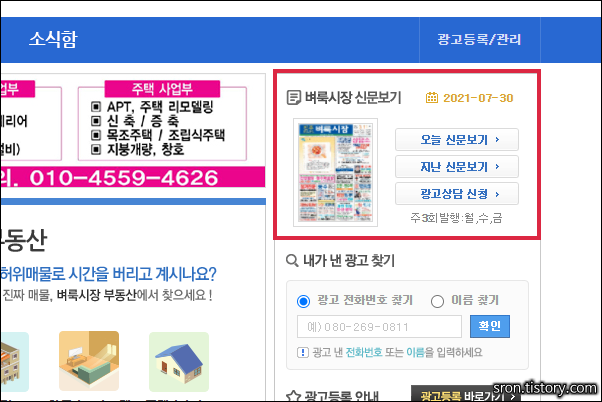 ▲ 벼룩시장 홈페이지 우측 상단의 [신문지역판] 메뉴를 통해 각 지역의 종이신문 이미지를 확인할 수 있습니다.