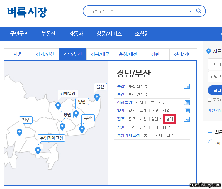 ▲ [경남/부산] - [남해] 지역을 선택하여 남해 벼룩시장으로 이동합니다.