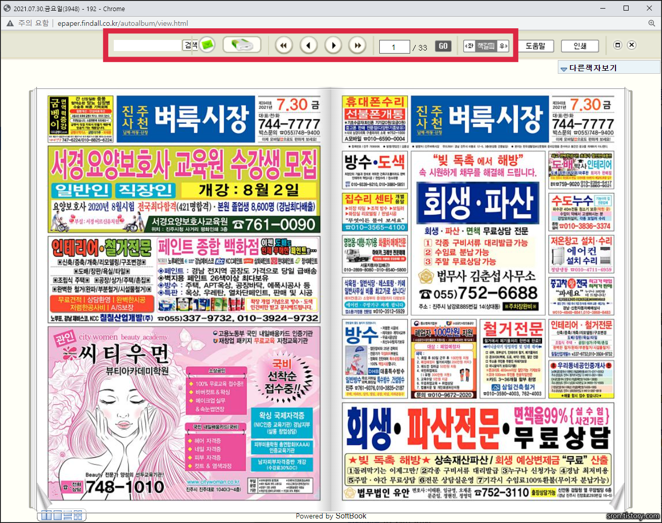 ▲ 위와 같이 벼룩시장의 신문 이미지를 그대로 확인할 수 있습니다. 상단의 메뉴바를 통해 광고검색, 페이지 이동, 확대, 축소 등의 기능을 사용할 수 있습니다. 종이신문 이미지로 구인구직 정보를 찾으신다면, 교차로 신문을 이용하는 것도 좋습니다.