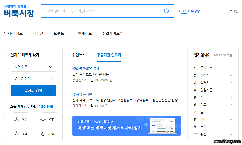 ▲ 벼룩시장의 메인페이지입니다. 상단의 [일자리정보], [인재정보], [취업가이드] 등의 메뉴를 통해 취업, 일자리 관련 정보를 확인할 수 있습니다. 또한, 취업뉴스, 공공기관 일자리, 인기 직업정보 등의 정보도 확인할 수 있습니다.
