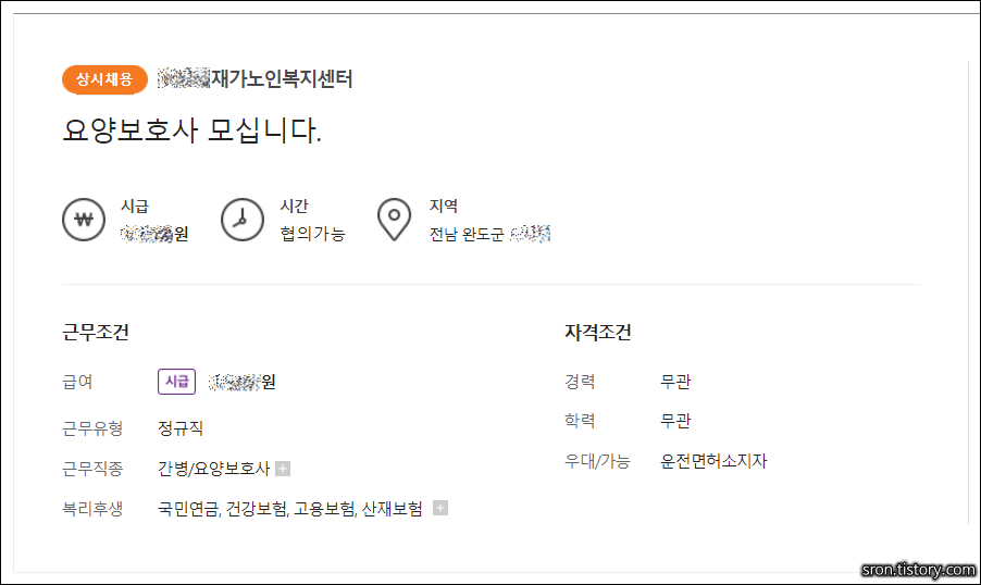 ▲ 채용공고 하나를 확인해보면 노인복지센터에서 요양보호사를 모집하는 공고가 있습니다. 모집요강을 통해 근무지, 근무기간, 근무시간, 급여 등 자세한 근무조건을 확인할 수 있습니다. 근무조건을 확인하시고 지원, 연락하시길 바랍니다.