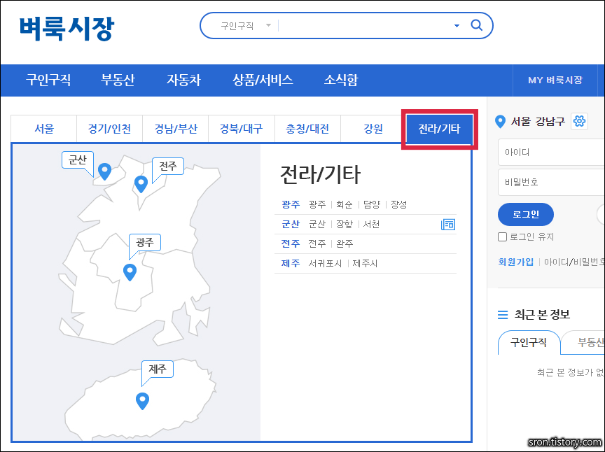 ▲ [전라/기타] 지역 메뉴에서 전라도, 제주도 지역에서 운영되고 있는 벼룩시장을 확인할 수 있습니다. 다만, 아쉽게도 전라도의 경우 현재 운영되고 있는 벼룩시장 지역신문이 많지 않으며, 완도 지역의 신문도 제공되지 않고 있습니다.