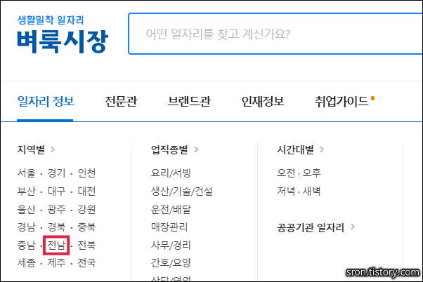 ▲ [일자리정보] - [지역별] 메뉴에서 [전남] 지역을 선택합니다. 지역별 검색 외에도 업직종별, 시간대별, 공공기관 일자리를 검색할 수 있습니다. 업직종별로는 음식점, 카페, 편의점, 공장, 건설현장, 운전기사, 화물기사, 사무직, 간호사, 요양서비스업 등의 공고를 확인할 수 있습니다.