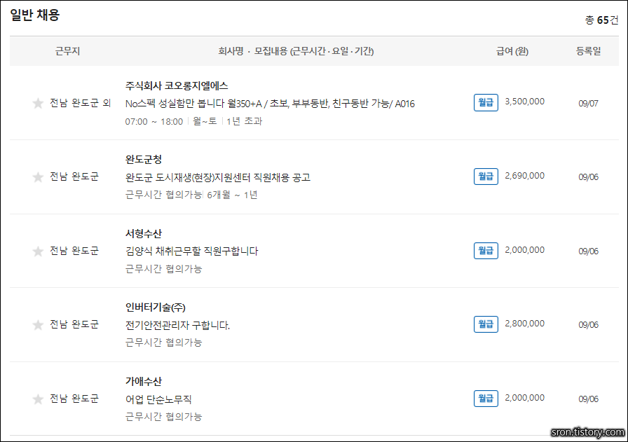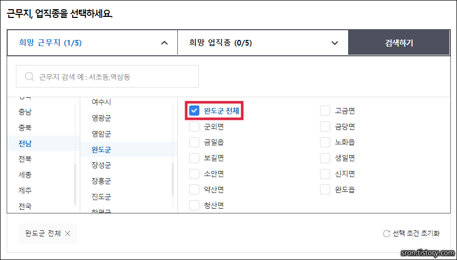 ▲ [전남] - [완도군] 지역을 선택하여 검색해주세요. 근무를 희망하는 주변 지역을 추가하여 검색할 수 있습니다. 해남, 장흥, 고흥, 강진 등 가까운 지역을 추가하여 검색해보세요.