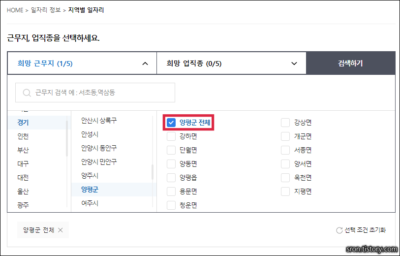 ▲ [경기] - [양평군] 지역을 선택하여 검색합니다. 근무를 원하는 주변 지역을 추가하여 검색할 수 있습니다. 광주, 하남, 남양주, 여주, 이천, 가평 등 근처의 지역을 추가하여 검색해보세요.