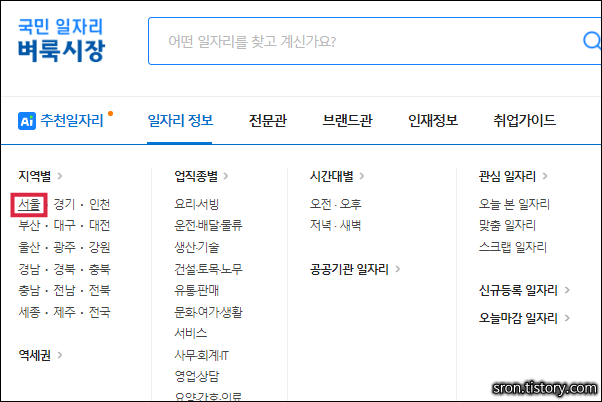 ▲ [일자리정보] - [지역별] 메뉴에서 [서울] 지역을 선택합니다. 지역별 검색 외에도 업직종별, 시간대별, 공공기관 일자리를 검색할 수 있습니다. 업직종별로는 외식업, 운전기사, 배달기사, 생산직, 기술직, 건설업, 단순노무, 서비스업, 요양서비스업 등의 채용공고를 확인할 수 있습니다.