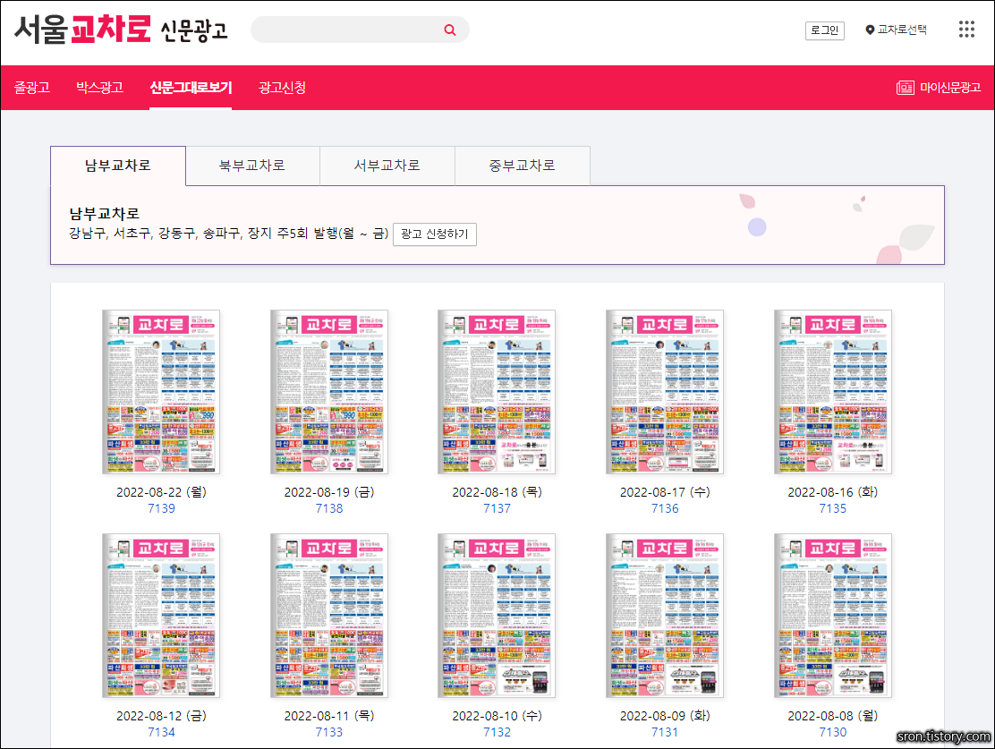 ▲ [남부교차로] 에서 강동구에서 발행되는 교차로 신문이 일자별로 제공되고 있습니다. 신문은 주 5회(월~금) 발행되고 있습니다.